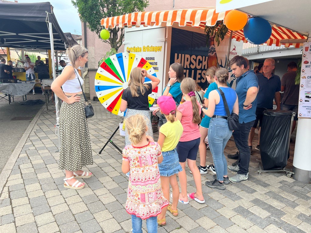 Neben den Crêpes war das Standhighlight unser Glücksrad, das wir zum ersten Mal im Einsatz hatten. Es drehte sich während des Festbetriebes fast pausenlos, und die Kinder kamen immer wieder, um einen der vielen Preise zu ergattern. Den Fassanstich zum Festbeginn am Samstagnachmittag begleitete eine Kombo aus Posaunenchor und HOO, die auch am Sonntag noch einmal an unserem Stand zu hören waren.